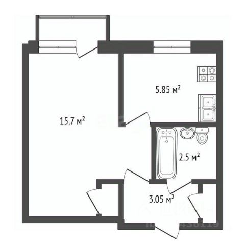 Общая площадь квартиры 30.1 кв. м., жилая 18,8 кв. м., кухня 5,9 кв. м.