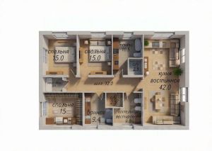 В доме предусмотрено три спальни и большая кухня-гостиная, 2 сан.узла, котельная, постирочная и просторный гардероб.