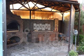 Участок 10 соток, ландшафт с газоном, декоративными кустами и деревьями. На участке летняя кухня с кирпичным камином.